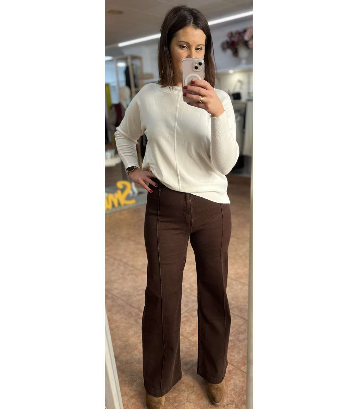 TEJANO EN COLOR MARRÓN CON COSTURA CENTRAL SIN BOLSILLOS DELANTEROS PERO SI TRASEROS.